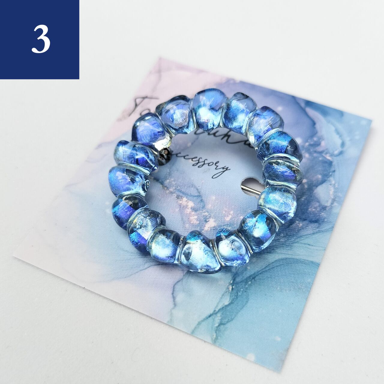 色硝子を重ねて窯の中で800℃に熱して溶かした硝子を一つ一つ丁寧に磨きあげ、台座に接着しレジンで補強しております。小さな小さな粒ですがその中には銀河のような煌めきが広がっており、まるで宇宙のようです。