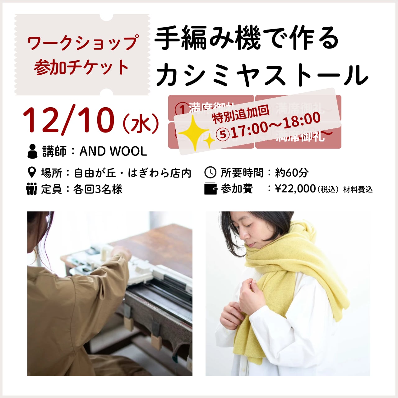 満席御礼【ワークショップ参加チケット】手編み機で作るカシミヤ大判ストール|12/10(水)東京・自由が丘