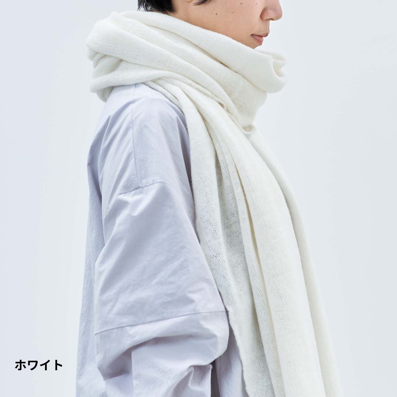 店内にて「AND WOOL」さんのスヌード・大判ストール商品を