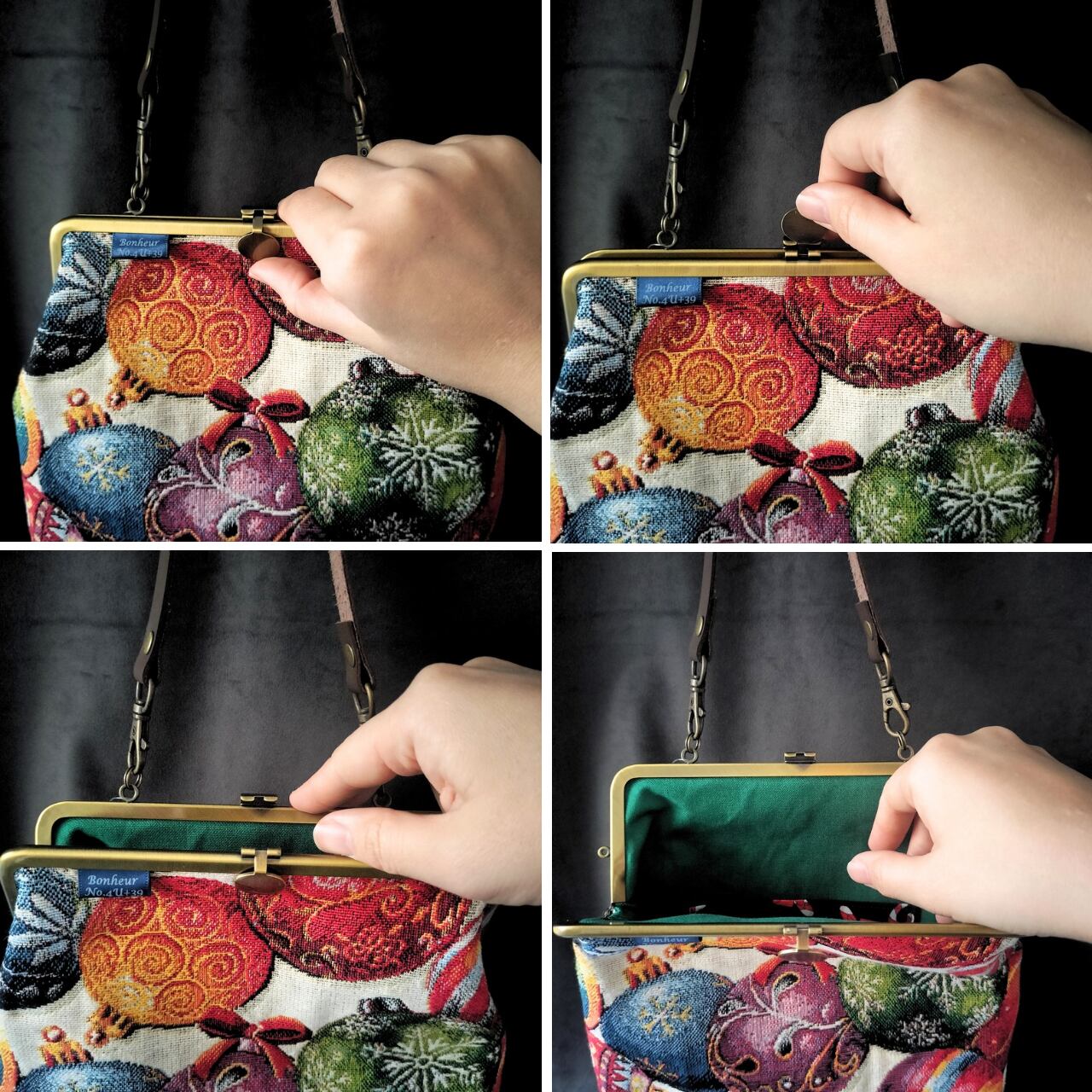 がま口の口金もさまざまで、作品ひとつひとつに宿る遊び心やきらめきは、