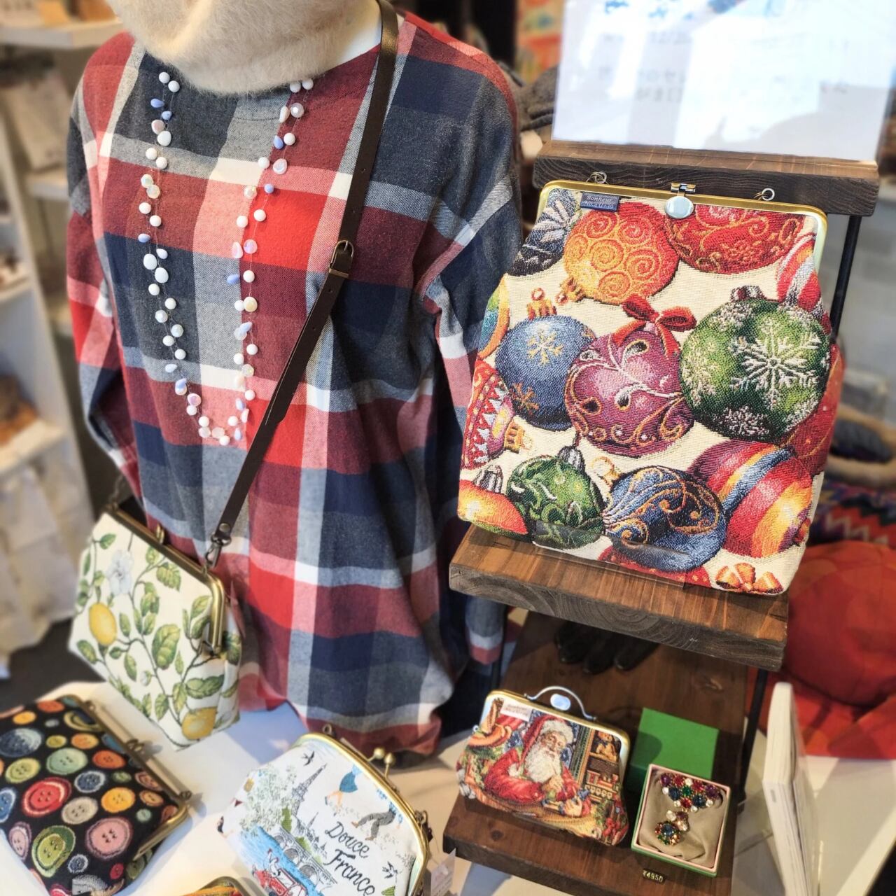がま口の口金もさまざまで、作品ひとつひとつに宿る遊び心やきらめきは、